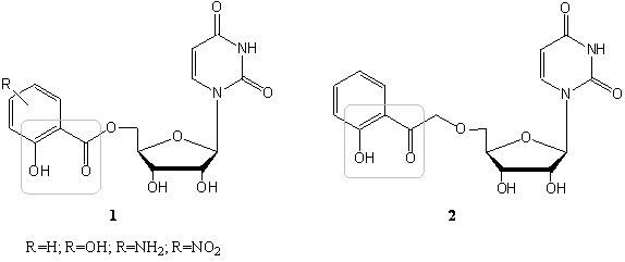 Target compounds were synthesized using protected uridine and salicyl chlorides in series 1 and 2’-bromo-2-benzyloxyacetophenone for compound 2. Synthetic details will be presented.