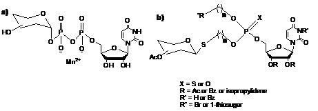 Glycosyltransferases are key enzymes responsible for biosynthesis of glycoconjugates that influence various intercellular and intracellular processes, such as bacterial or viral infection, adhesion in inflammation, tumor metastasis or activation of the innate immune system [1]. Development of glycosyltransferases’ inhibitors allows modulating their activity and may lead to development of potential therapeutic agents. UDP-sugars are